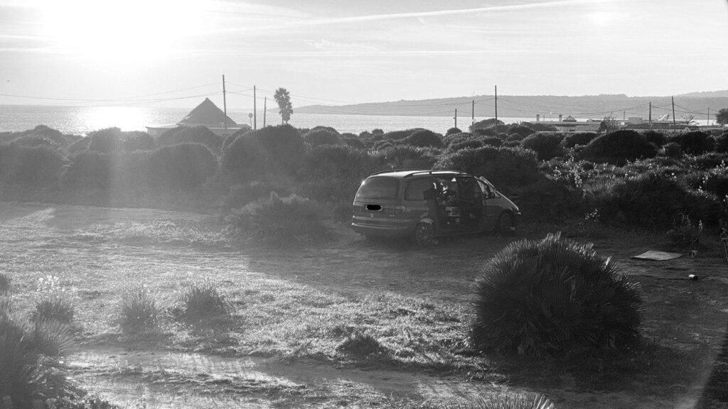 Aber hier auf dem Platz, nicht sehr weit entfernt, lebt ein Mann mittleren Alters in seinem Pkw. Dauerhaft. Und – so munkelt man – er soll auch dauerhaft hier auf diesem Platz in Südspanien stehen. Das alleine wäre ja kein Grund, darüber ein Wort zu verlieren. Doch findet sein Leben eben außerhalb seines Pkw statt. Und damit es da nicht so öde ist, hört er bei geöffneter Heckklappe Musik.
